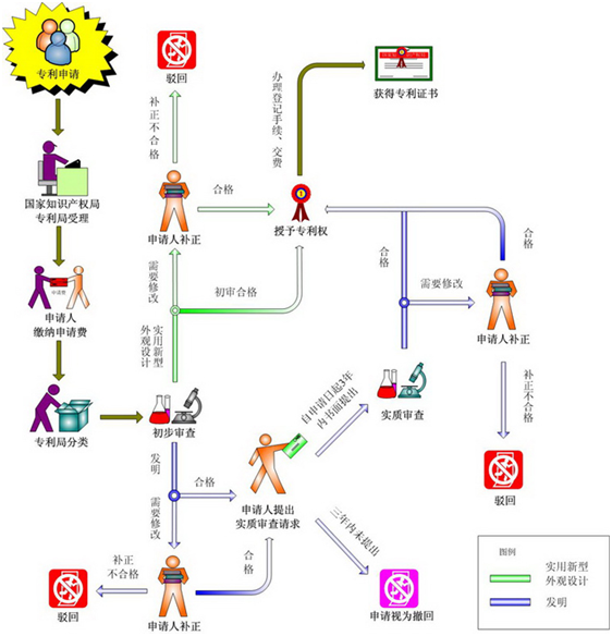 發(fā)明、實(shí)用新型和外觀設(shè)計(jì)專利的申請(qǐng)、審查流程圖如下: